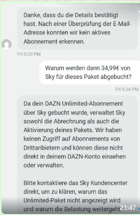 Nun beginnt ein zweimonatiges Pingpong-Spiel. Sky sagt, der Fehler liegt bei DAZN, DAZN sagt zu meinen Anmeldedaten besteht keine gebuchte "Unlimited"-Option über Sky, ich soll mich an Sky wenden. Aus meiner Sicht wäre Sky auch für mich der Ansprechpartner. Schließlich heißt es ja: "Alle Vorteile von DAZN über Sky - Abrechnung und Kundenservice aus einer Hand. Sky ist ihr Ansprechpartner".