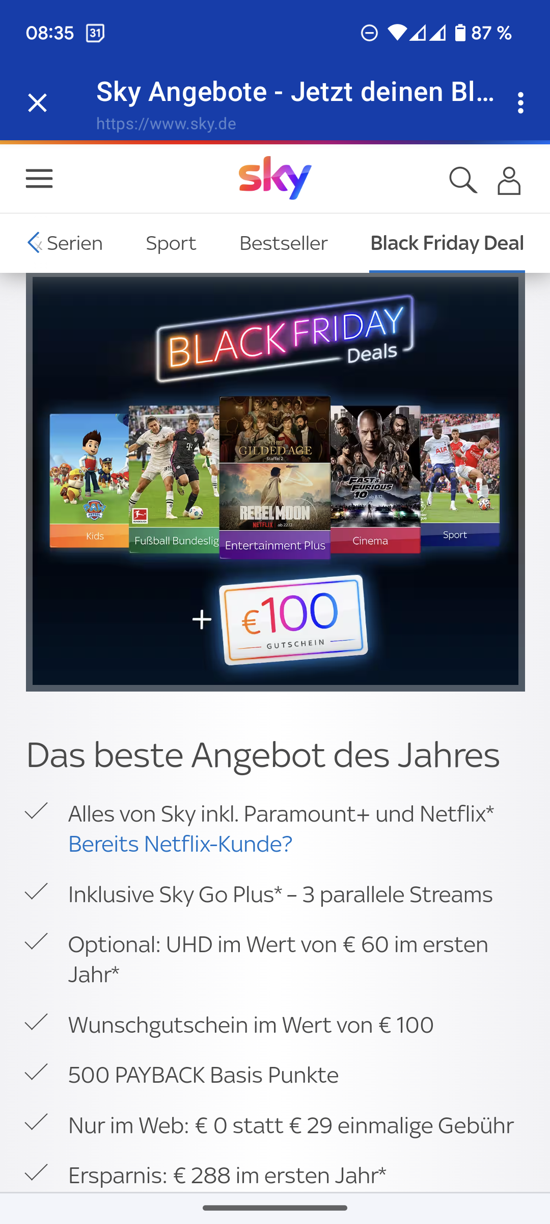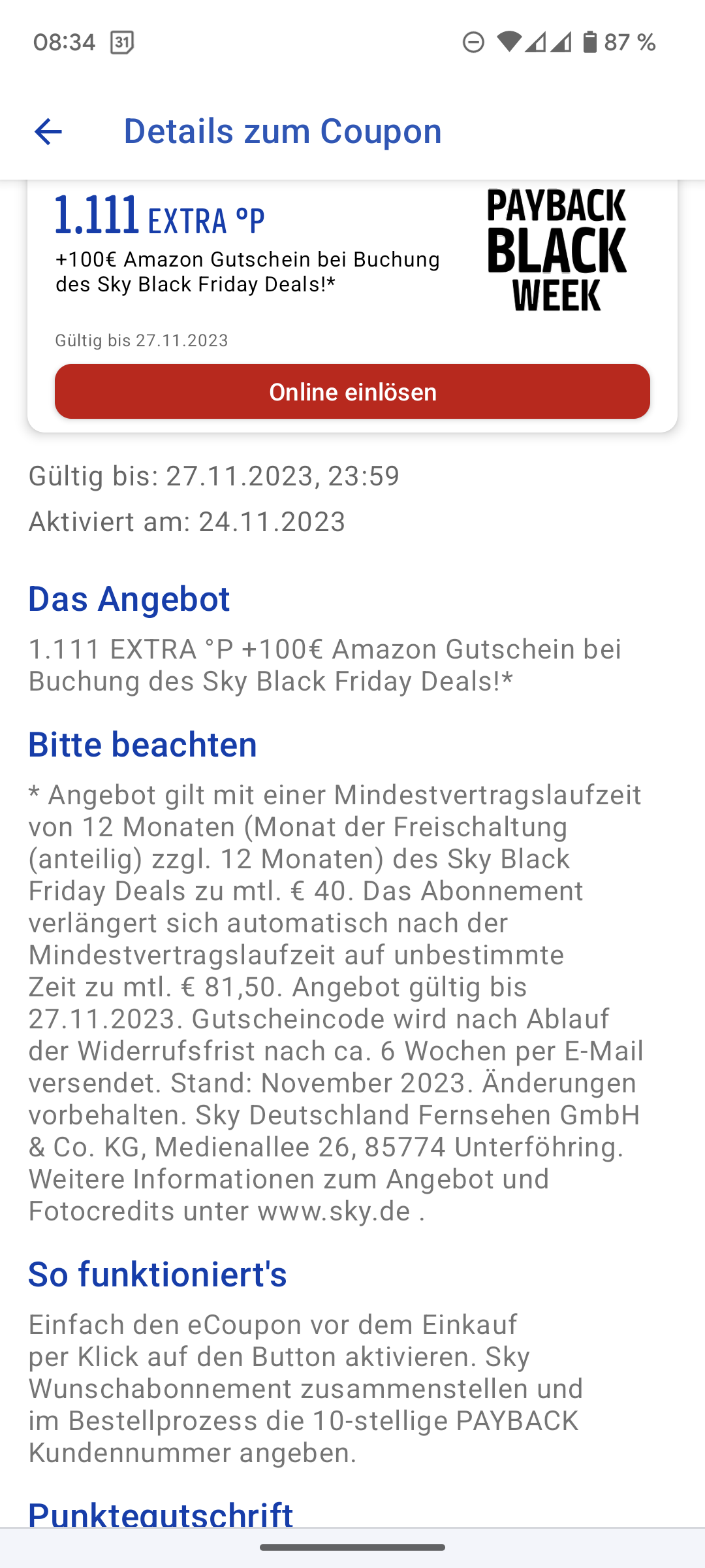 bei Payback wurden für das Black Friday-Angebot bei Sky 1111 Punkte + 100€-Amazon-Gutschein beworben. Bei Sky wiederum ein weiterer 100€-Wunschgutschein für den Abschluss des Komplettabos. Siehe Screenshots.